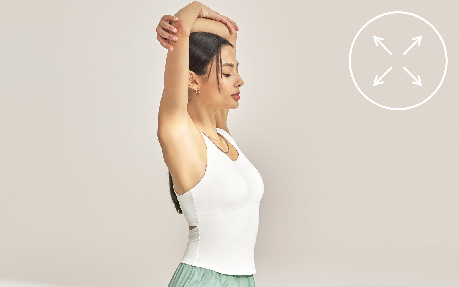 The addition of a logo band at the bottom of the bra lining ensures a stable and secure fit, preventing it from riding up even when lifting your arms.