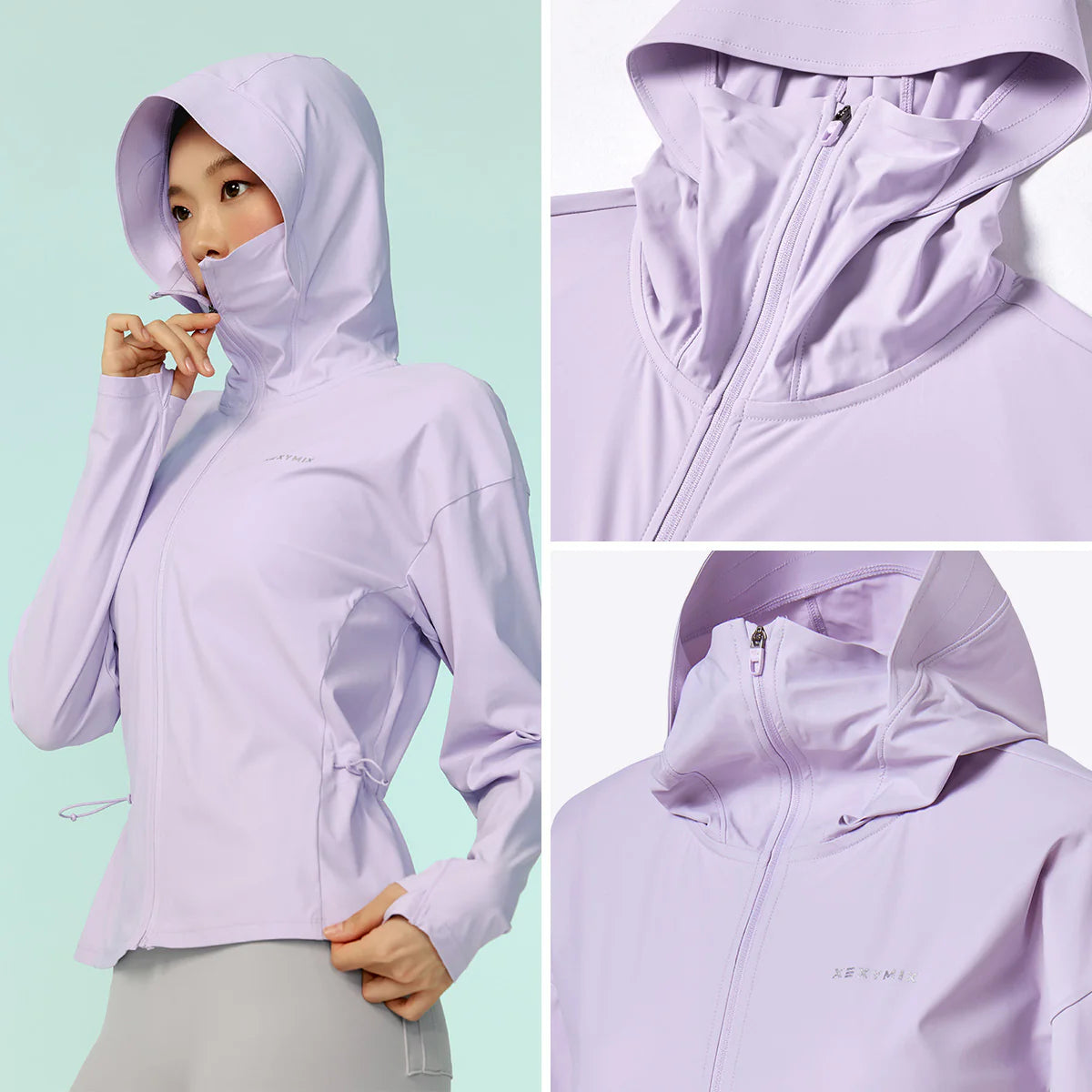 The front zipper closes all the way up to just below the eyes, forming a mask-like design that minimizes UV exposure.