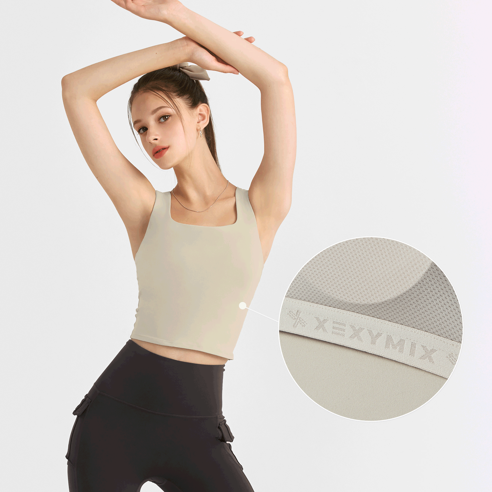 A logo band is added to the bra lining hem to provide a stable fit without being rolled up even when performing arm-raising.