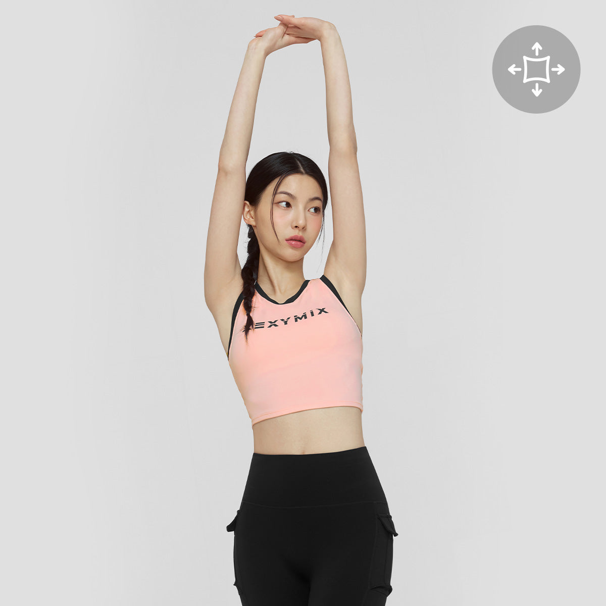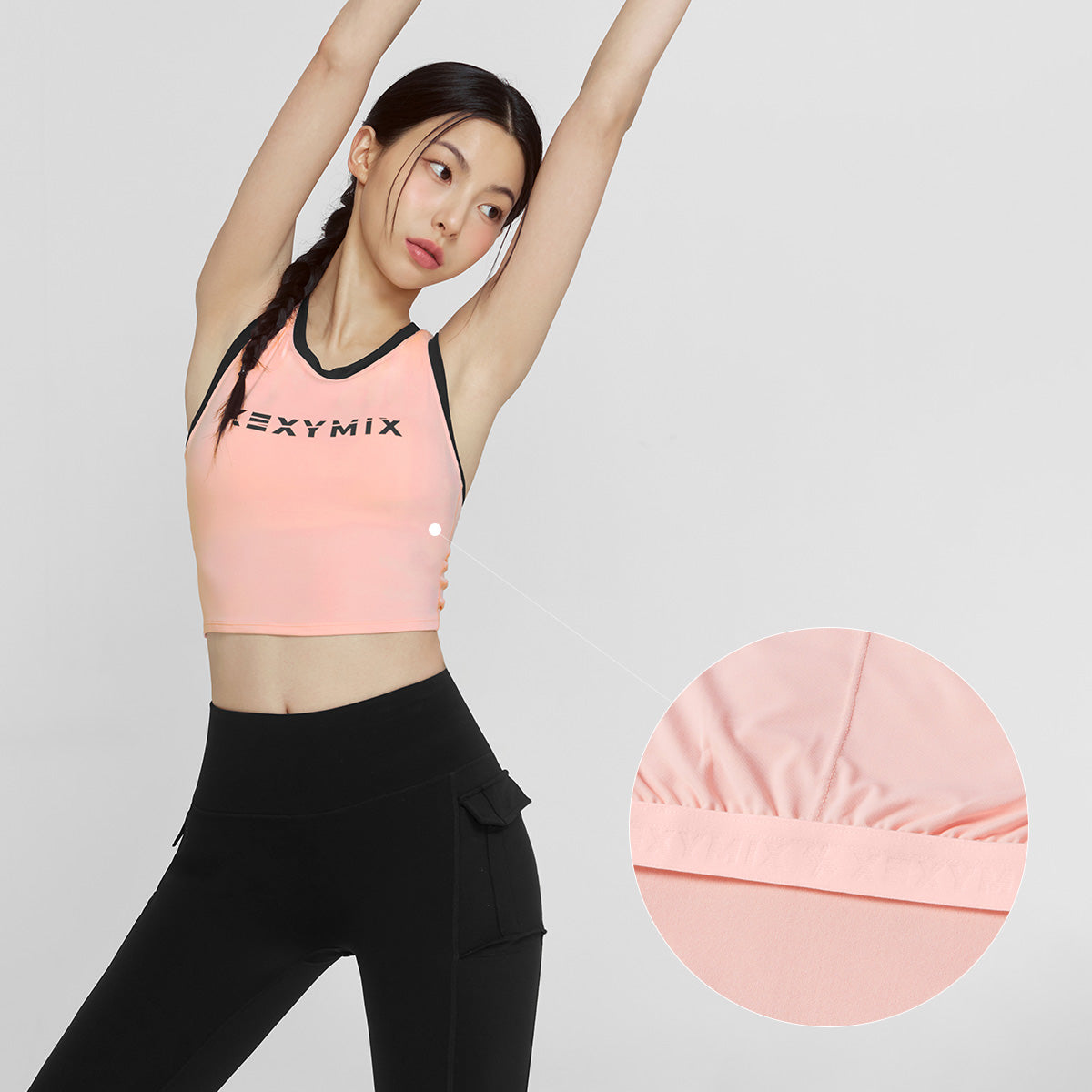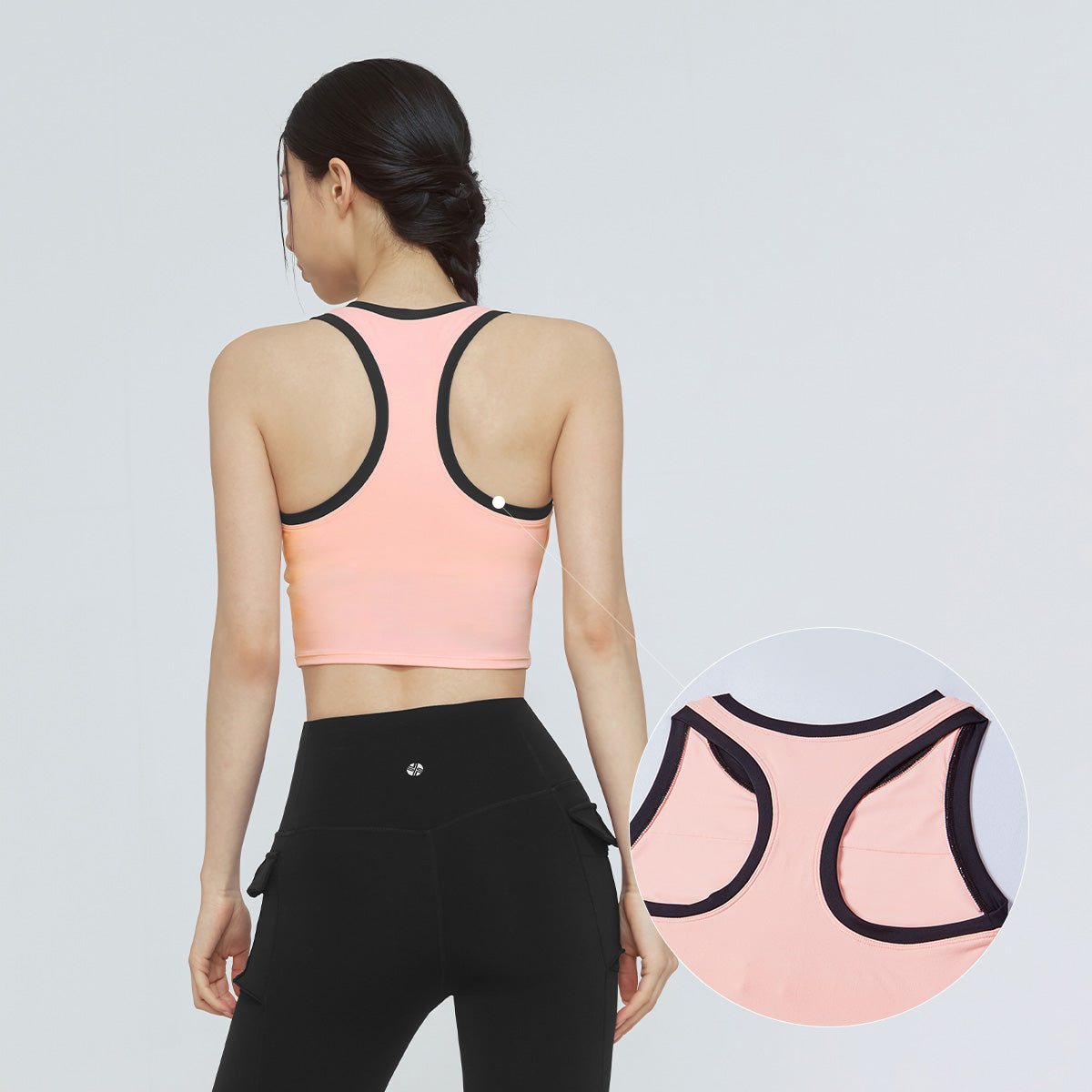 The bra features a highly elastic band at the underbust, providing stable support without rolling up, even during overhead movements.