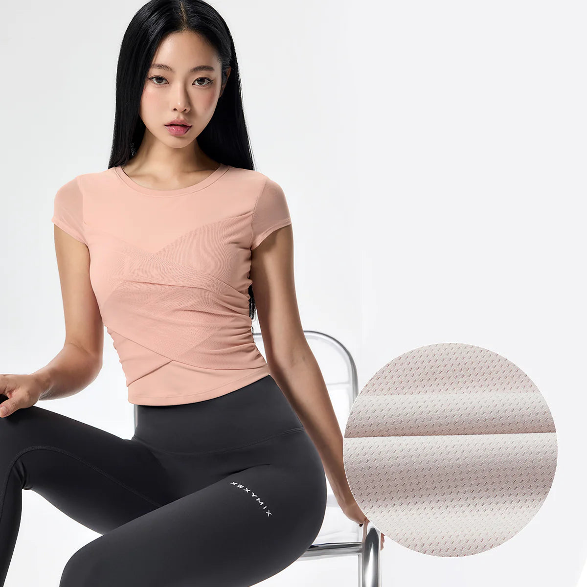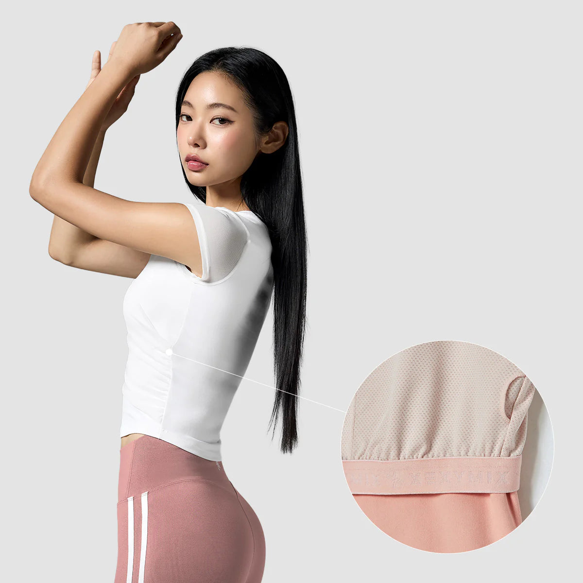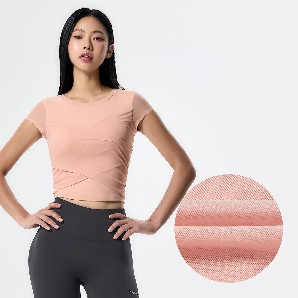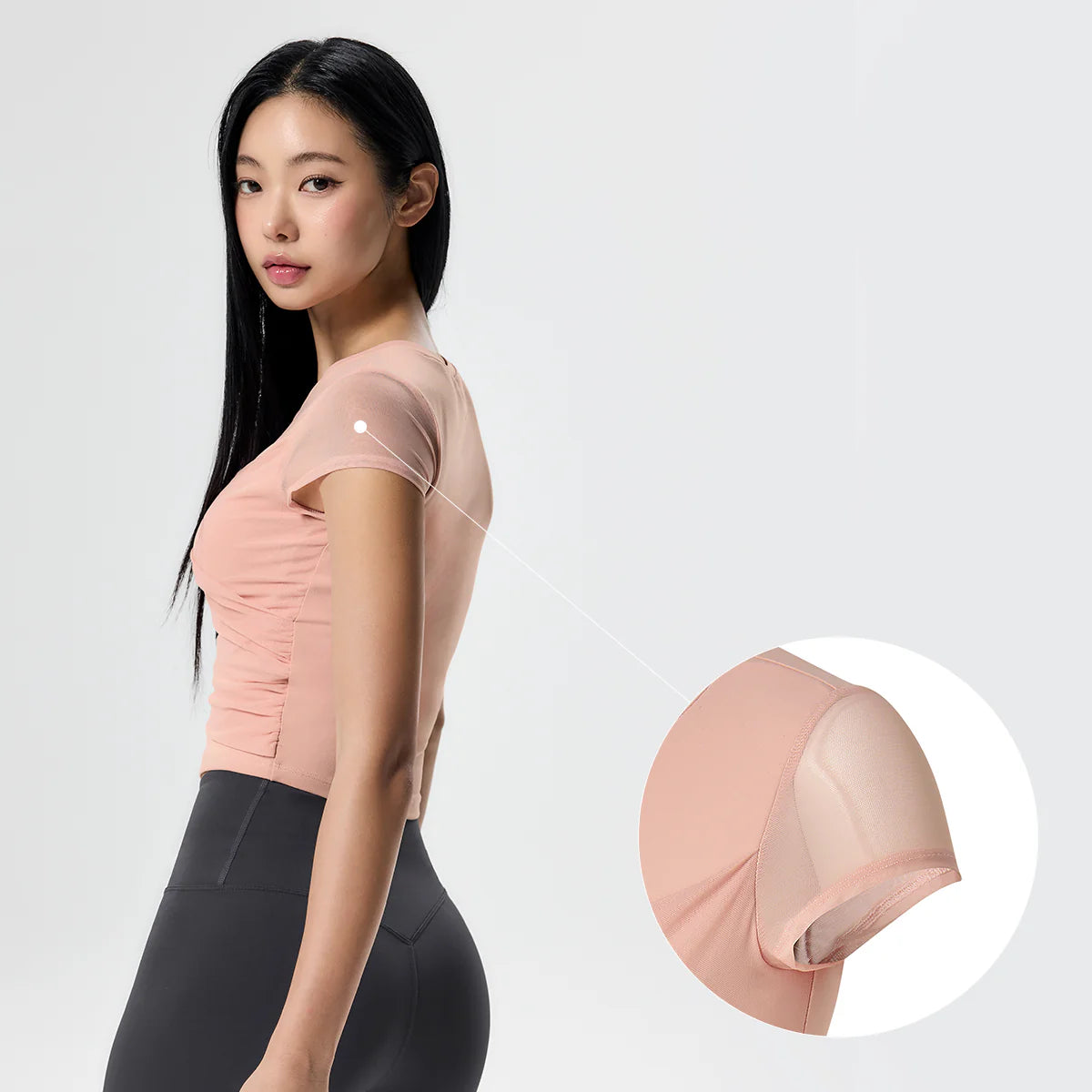 The subtly sheer mesh cap-sleeve design keeps you comfortable and unrestricted during active movement, while creating a soft and feminine look.