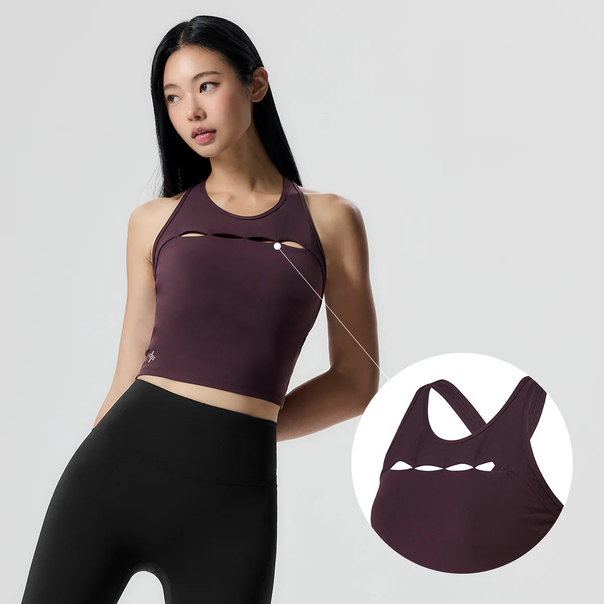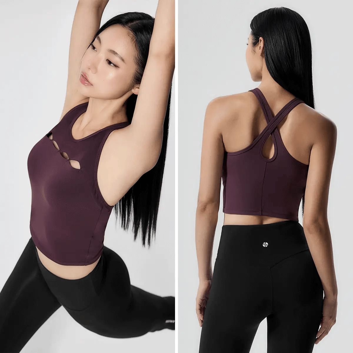 The X-back design allows full freedom of movement without restricting the shoulder blades, making it easy to observe back muscle activity during workouts. A teardrop-shaped cutout at the center enhances breathability.