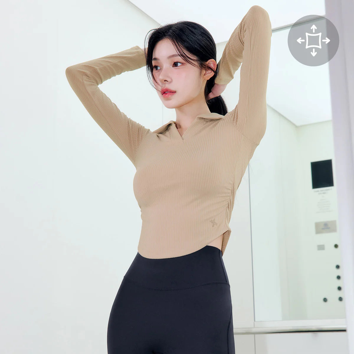 Featuring a ribbed texture and blended with flexible polyurethane yarn, the material stretches with your movements, providing support and ease even during active wear.